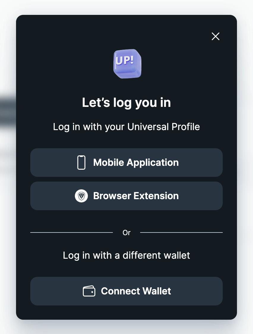 | UP Mobile | WalletConnect (deep link on mobile, QR code on desktop) |